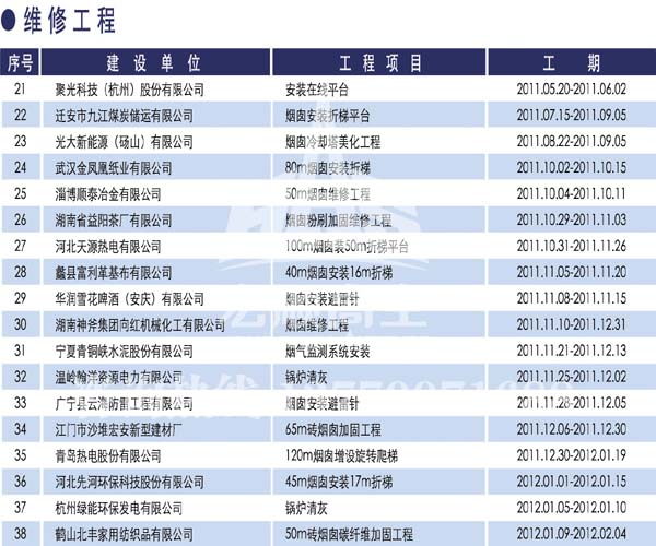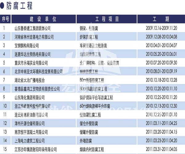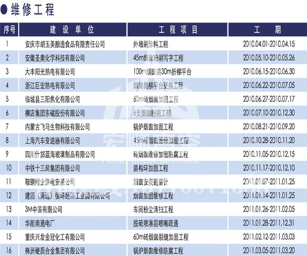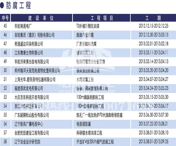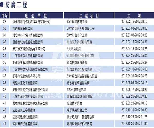 宏順建設工程有限公司是國家批準成立的專業(yè)高空作業(yè)企業(yè):承攬過(國內.國外)煙囪新建、煙囪防腐、吊機防腐、水塔防腐、管道防腐、龍門吊防腐、儲存罐防腐、煙囪內壁防腐等高空作業(yè)工程。具有“不搭腳手架 、 不需要停產”施工特點。
